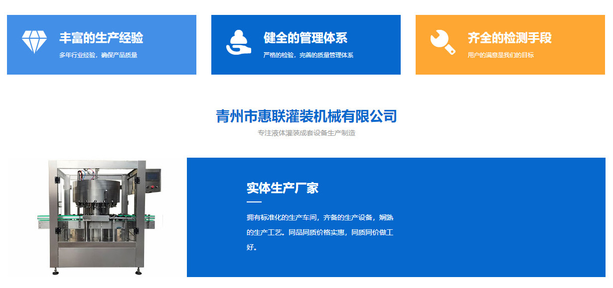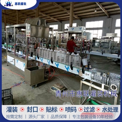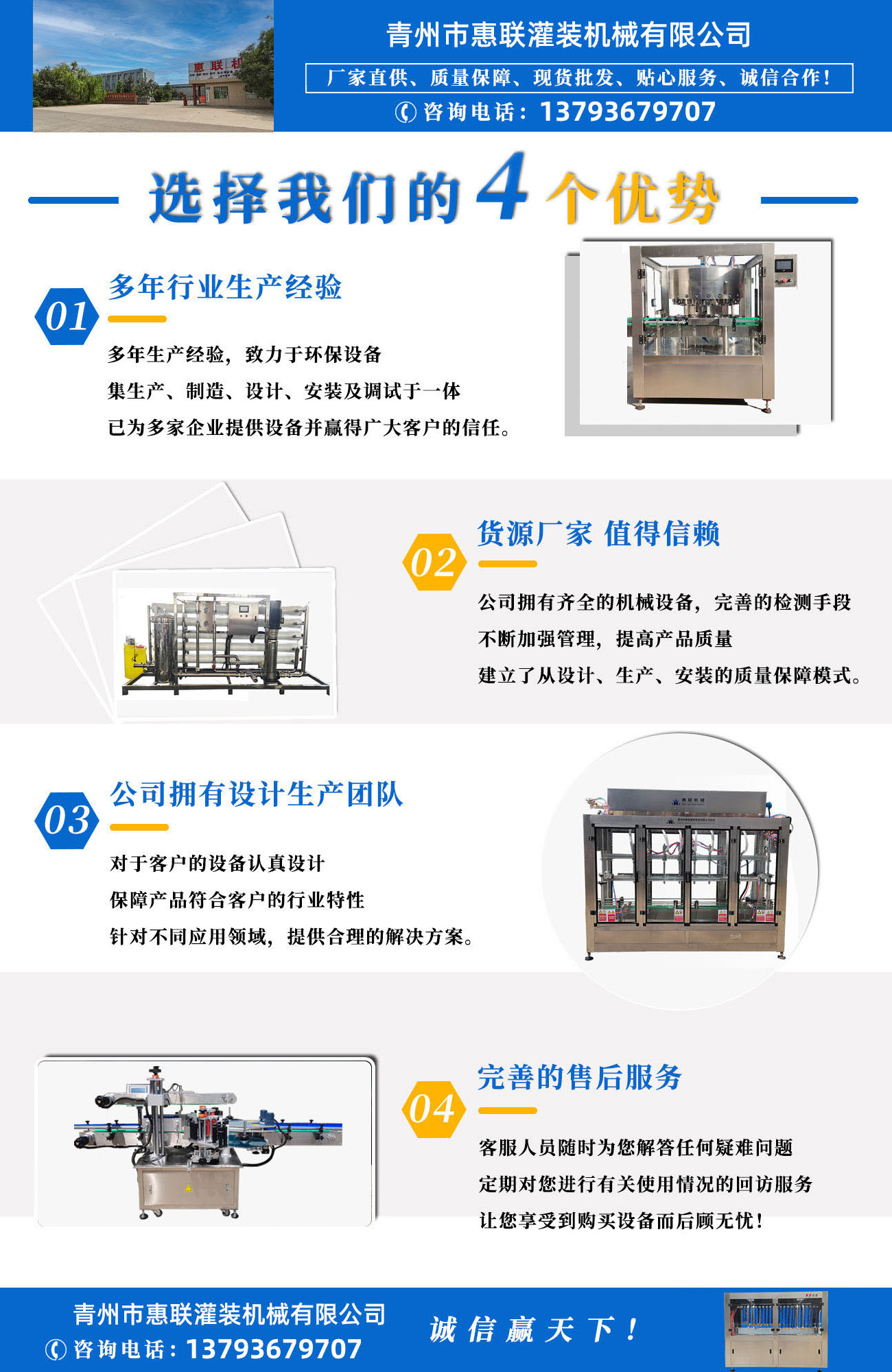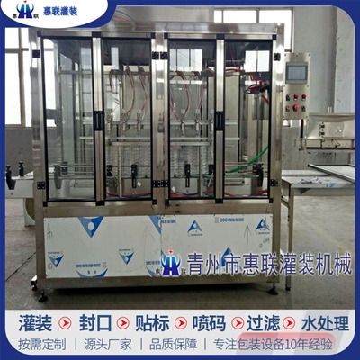 青州市惠聯(lián)灌裝機(jī)械有限公司是一家集生產(chǎn)研發(fā)、銷售、服務(wù)于一體的液體灌裝成套設(shè)備生產(chǎn)企業(yè),可根據(jù)廠家要求設(shè)計合理液體灌裝生產(chǎn)線,為用戶提供技術(shù)咨詢、設(shè)計工藝、場區(qū)平面布置、工藝改造、設(shè)備安裝調(diào)試等完善服務(wù)。 公司生產(chǎn)制造各種類型液體灌裝機(jī)、過濾機(jī),水處理設(shè)備及液體灌裝成套設(shè)備。主要產(chǎn)品有:白酒、葡萄酒、黃酒等酒水灌裝機(jī)、食用油、機(jī)油、潤滑油等油類灌裝機(jī)、醬油醋、老抽、生抽等調(diào)味品灌裝機(jī)、防凍液、玻璃水灌裝機(jī)、酒精、84消毒液灌裝機(jī)、車用尿素灌裝機(jī)、口服液灌裝機(jī)、洗滌劑灌裝機(jī)等多種液體、膏體灌裝設(shè)備,全自動/半自動灌裝機(jī)型號多,規(guī)格全,洗瓶機(jī)、瓶子封口機(jī)、打塞機(jī)、熱縮機(jī)、瓶子烘干機(jī)、貼標(biāo)機(jī)、噴碼機(jī)、輸送線、裝箱機(jī)、水處理設(shè)備等全套生產(chǎn)線相關(guān)配套設(shè)備齊全,自產(chǎn)自銷,一站式購齊,售后無憂。